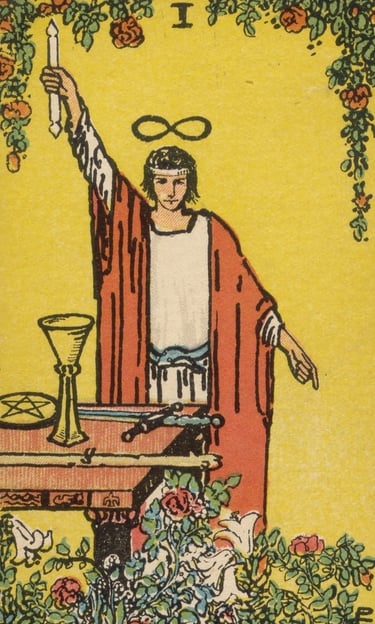 Era uma figura imponente, embora sua aparência fosse simples. Vestia um manto vermelho sobre uma túnica branca, que contrastavam com o verde das árvores ao redor. Seus olhos eram penetrantes, como se enxergassem além do visível, além do físico, mergulhando diretamente na essência das coisas. Sobre sua cabeça, o símbolo do infinito, como uma marca de sabedoria oculta. Suas mãos pairavam sobre a mesa, manipulando os quatro elementos que estavam diante dele: uma espada, uma taça, uma moeda e um bastão.
