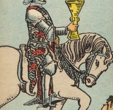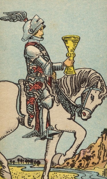 O próximo Cavaleiro que o Louco encontrou foi o Cavaleiro de Copas, segurando uma taça com delicadeza enquanto cavalgava calmamente. A energia dessa carta era de busca emocional, amorosa e criativa. O Cavaleiro de Copas era um sonhador, um amante das artes e dos sentimentos profundos, sempre em busca de beleza e conexão emocional. Ele representava a ação guiada pelo coração e pela imaginação, movendo-se com graça e sensibilidade.