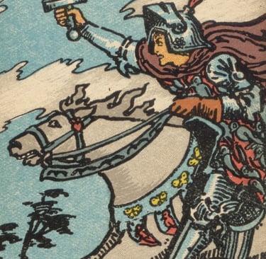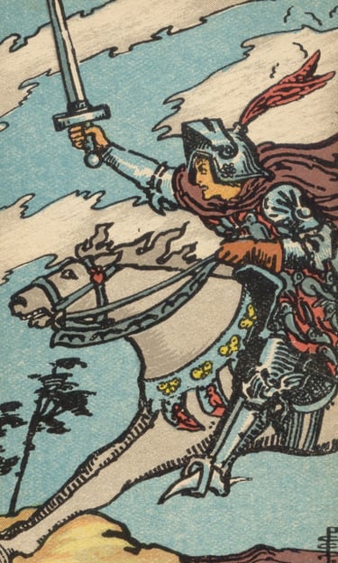 Logo depois, o Louco se deparou com o Cavaleiro de Espadas, cavalgando rapidamente, com a espada erguida e os olhos fixos no horizonte. A energia dessa carta era de ação rápida, raciocínio afiado e uma determinação incansável em direção a um objetivo. O Cavaleiro de Espadas representava a força mental em sua forma mais dinâmica, sempre pronto para enfrentar desafios com coragem e convicção, movido por ideias claras e a urgência de comunicar e agir.