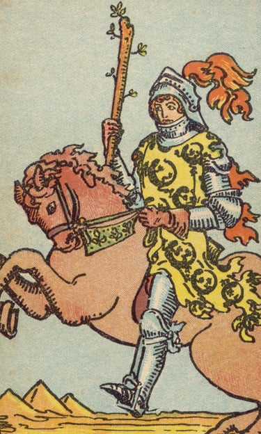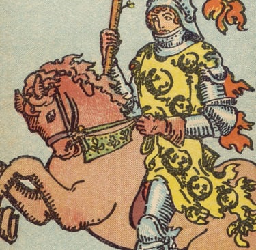 Depois de aprender com a curiosidade e a inexperiência dos Pajens, o Louco avançou para uma nova fase de sua jornada, onde ele encontraria os Cavaleiros. Estes representavam uma evolução em relação aos Pajens, sendo figuras que, embora ainda jovens, já haviam amadurecido e agora buscavam aplicar o que aprenderam de maneira ativa e dinâmica. Os Cavaleiros traziam a energia do movimento, da ação e da determinação. Cada um representava uma maneira de conduzir a jornada em direção a um objetivo, com coragem e propósito.