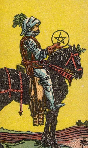 O primeiro que o Louco encontrou foi o Cavaleiro de Ouros, montado em seu cavalo, segurando uma moeda dourada com firmeza. Ao contrário de seus colegas Cavaleiros, este não corria em direção ao horizonte, mas seguia com cuidado e precisão. A energia dessa carta era de diligência, paciência e um trabalho constante, porém meticuloso. O Cavaleiro de Ouros representava o trabalhador incansável, alguém que, embora movido pela ação, sabia que o progresso sustentável vinha da perseverança e do planejamento cuidadoso.