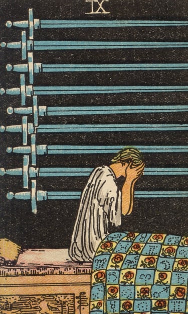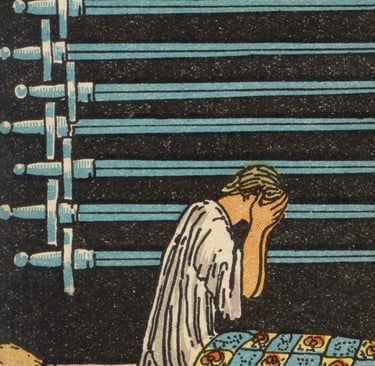 Ao se aproximar das espadas, o Louco foi invadido por uma sensação de angústia, de estar aprisionado por pensamentos que não cessavam. Ele entendeu que o Nove de Espadas falava sobre as tormentas da mente, os arrependimentos e os medos que, muitas vezes, nos impedem de encontrar paz. Era um lembrete de que as preocupações e ansiedades, se não forem enfrentadas, podem nos consumir por completo.
