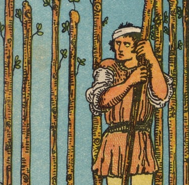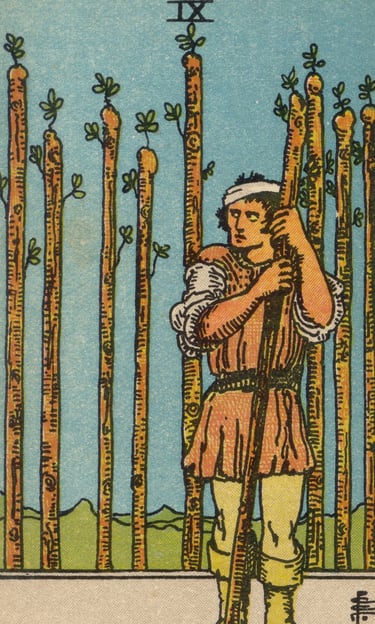 Por fim, o Louco encontrou uma figura em pé, apoiada em um bastão, cercada por outros bastões, com uma expressão de alerta e resiliência — o Nove de Paus. A energia dessa carta era de persistência, defesa e superação de obstáculos. O Louco sentiu a tensão dessa figura, que, embora machucada e cansada, permanecia de pé, pronta para enfrentar qualquer desafio que surgisse.