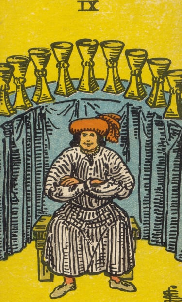Ao tocar uma das taças, o Louco foi preenchido por uma sensação de contentamento profundo. Ele entendeu que o Nove de Copas falava sobre a realização de desejos e a gratificação emocional que surge quando alcançamos aquilo que nos preenche de verdade. Esta carta era um símbolo de felicidade pessoal, onde os desejos do coração se alinham com as circunstâncias da vida.