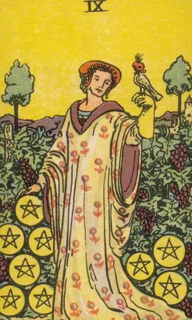 Ao tocar uma das moedas, o Louco foi tomado por uma sensação de satisfação e orgulho. Ele compreendeu que o Nove de Ouros falava sobre o prazer de ver o resultado tangível de anos de esforço e comprometimento. Era um símbolo de prosperidade e luxo conquistados com paciência, onde o sucesso material vinha acompanhado de uma sensação de controle sobre o próprio destino.