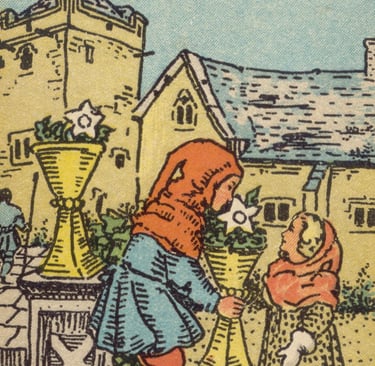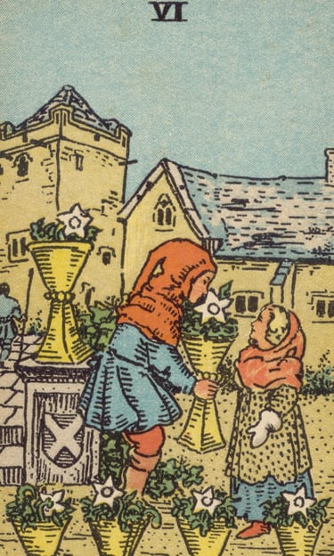 Ao prosseguir, o Louco encontrou uma cena cheia de nostalgia e ternura — duas crianças trocavam flores entre si, cercadas por um jardim tranquilo — o Seis de Copas. A energia desse símbolo era de reconciliação emocional, de memórias doces e inocentes, e de uma conexão com o passado que trazia conforto e alegria. O Louco sentiu o calor desse momento, que o convidava a revisitar o que lhe trazia alegria e afeto.