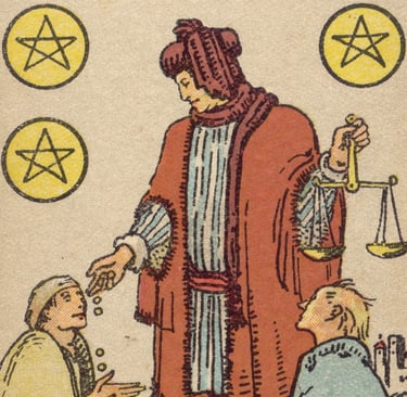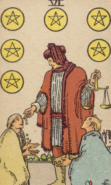 A primeira visão que o Louco encontrou foi a de um homem generoso, repartindo suas moedas entre dois necessitados — o Seis de Ouros. A energia desse símbolo era de equilíbrio material e generosidade. O Louco percebeu que, depois da perda e do medo de escassez representados no Cinco de Ouros, o Seis de Ouros trazia a lição do fluxo equilibrado de dar e receber.