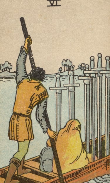 Mais adiante, o Louco viu um barco que deslizava suavemente sobre águas tranquilas, com três figuras deixando para trás uma terra sombria e navegando rumo a um novo horizonte — o Seis de Espadas. A energia desse símbolo era de transição, de mudança mental e superação de conflitos intelectuais. O Louco sentiu que o Seis de Espadas representava o movimento em direção à paz após um período de turbulência mental e emocional.