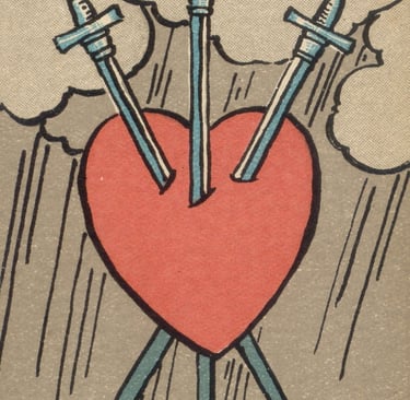 Um pouco mais adiante, três espadas cruzadas perfuravam o centro de um coração radiante — o Três de Espadas. A energia ali era diferente, mais pesada, carregada de dor e revelação emocional. O Louco sentiu que esse símbolo representava as feridas que inevitavelmente surgem quando o coração é exposto à verdade e ao conflito.