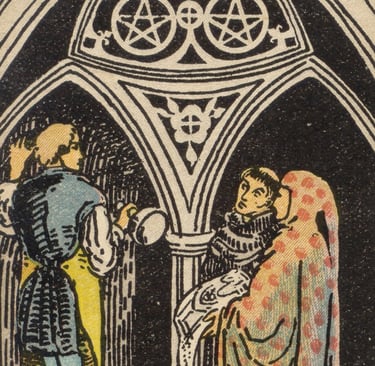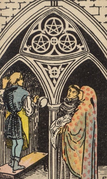 Ao se aproximar, o Louco observou três figuras trabalhando em harmonia, cada uma desempenhando um papel importante na construção daquele templo. Ele compreendeu que o Três de Ouros simbolizava a necessidade de colaboração para manifestar projetos grandiosos. Não era mais uma questão de esforço individual, mas de união de habilidades e talentos diferentes para criar algo maior que qualquer um poderia fazer sozinho.