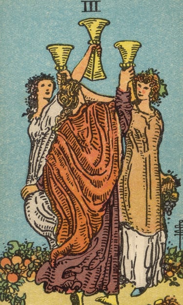 Em seguida, o Louco avistou três taças erguidas no ar, entrelaçadas por mãos festivas e sorridentes — o Três de Copas. A energia desse símbolo era leve, alegre e repleta de celebração. Ao se aproximar, ele sentiu uma onda de felicidade, de camaradagem e de união emocional que se manifestava através da partilha e do convívio.