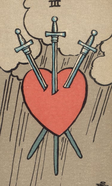 Ao tocar as espadas, o Louco foi inundado por uma sensação de perda e sofrimento. Ele viu momentos de separação, desilusões e traições. O Três de Espadas era o lembrete de que, no caminho da vida, nem tudo seria harmonia e alegria. Haveria momentos de dor, onde a verdade cortaria profundamente, expondo fragilidades e feridas que precisavam ser curadas.