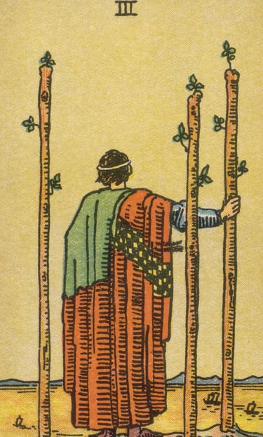 Ao tocar os bastões, o Louco viu-se em um porto, observando um navio pronto para partir rumo a terras desconhecidas. O Três de Paus simbolizava o momento em que a preparação já havia sido feita, e agora era hora de expandir, de colocar em prática as ideias e os planos para descobrir o que o futuro reservava.