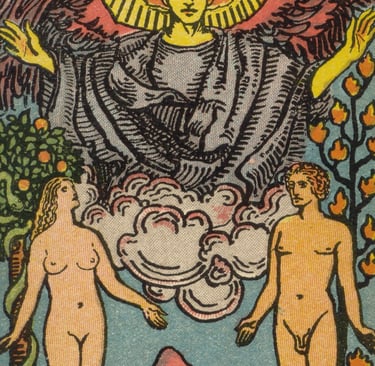 Ele logo encontrou um jardim exuberante, repleto de flores que pareciam exalar uma fragrância doce e hipnotizante. No centro desse oásis, um cenário inesperado aguardava: duas figuras, uma masculina e outra feminina, de pé, em uma clareira. Havia algo entre eles, uma força invisível que o Louco imediatamente reconheceu, mas não compreendia completamente. Acima deles, um anjo de asas abertas pairava, irradiando luz dourada e segurando um arco, como um guardião sagrado daquilo que estava prestes a acontecer.