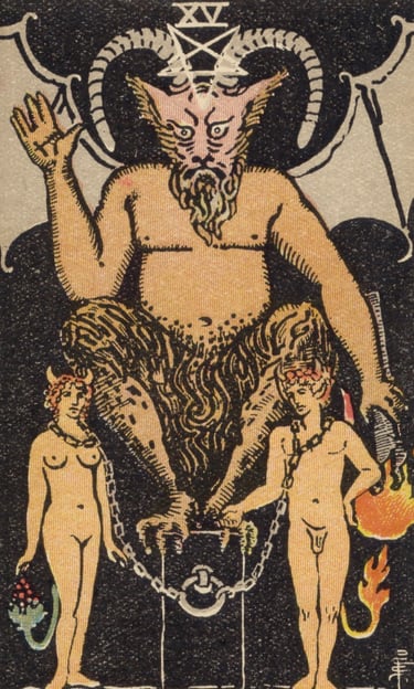 O Louco hesitou. Ele havia ouvido falar dessa figura, uma entidade associada à escravidão, ao desejo, ao vício e à ilusão. No entanto, não era o medo que o paralisava, mas uma curiosa atração. Havia algo magnético e sedutor no Diabo. Ao redor do trono, ele via correntes pesadas que prendiam dois seres: uma figura masculina e outra feminina. Seus corpos estavam marcados pela submissão, e, apesar das correntes frouxas, eles permaneciam ali, como se não quisessem se libertar.