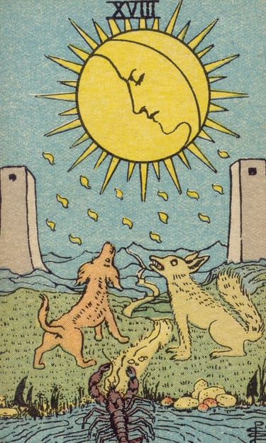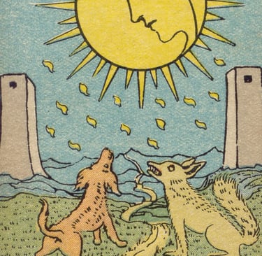 Enquanto ele observava a paisagem refletida nas águas escuras do lago, figuras começaram a emergir. Lobos uivavam para a Lua, e no meio deles, um cão o encarava, com os olhos brilhando como brasas. Ambos representavam os aspectos primitivos e instintivos de seu ser, aqueles que a Lua iluminava e trazia à tona. O lobo simbolizava o lado selvagem e indomável, enquanto o cão representava a domesticação, o controle que o Louco tentava exercer sobre seus próprios impulsos.